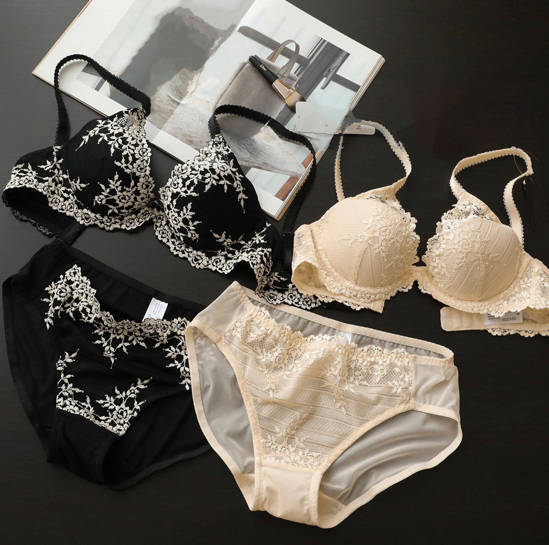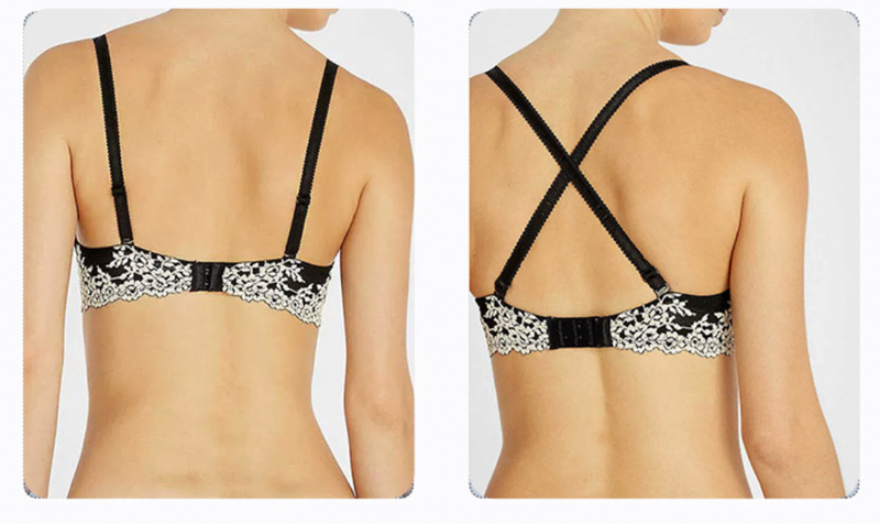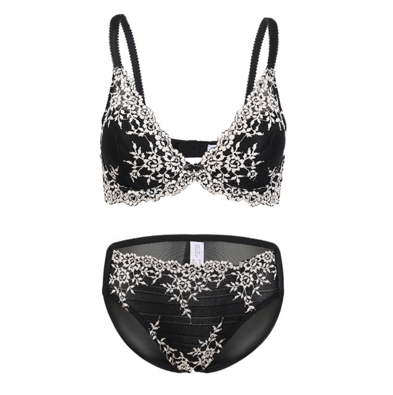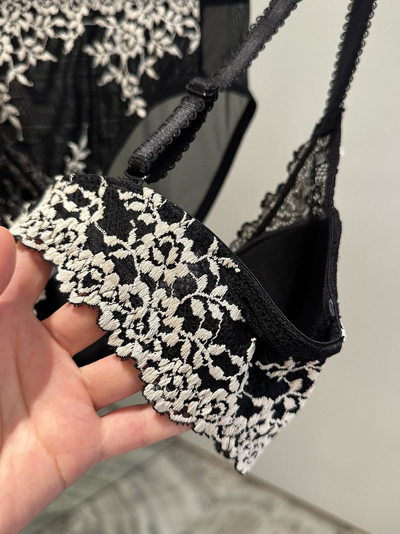 Feel yourself in comfy cuddle wireless lace bra. It comes with beautiful sheer floral net panty. Underwire cups- Adjustable Straps - Back hook-and-eye closure