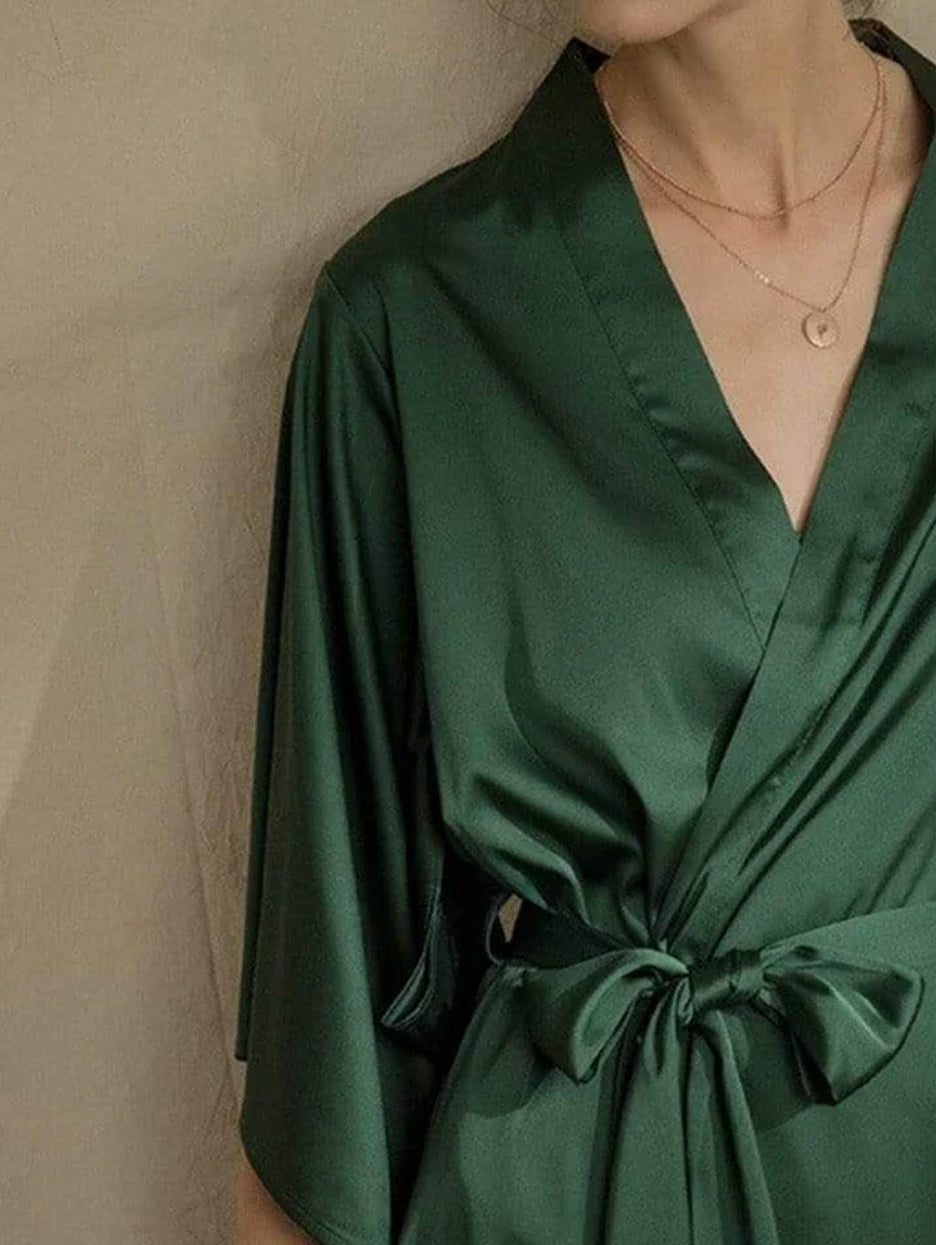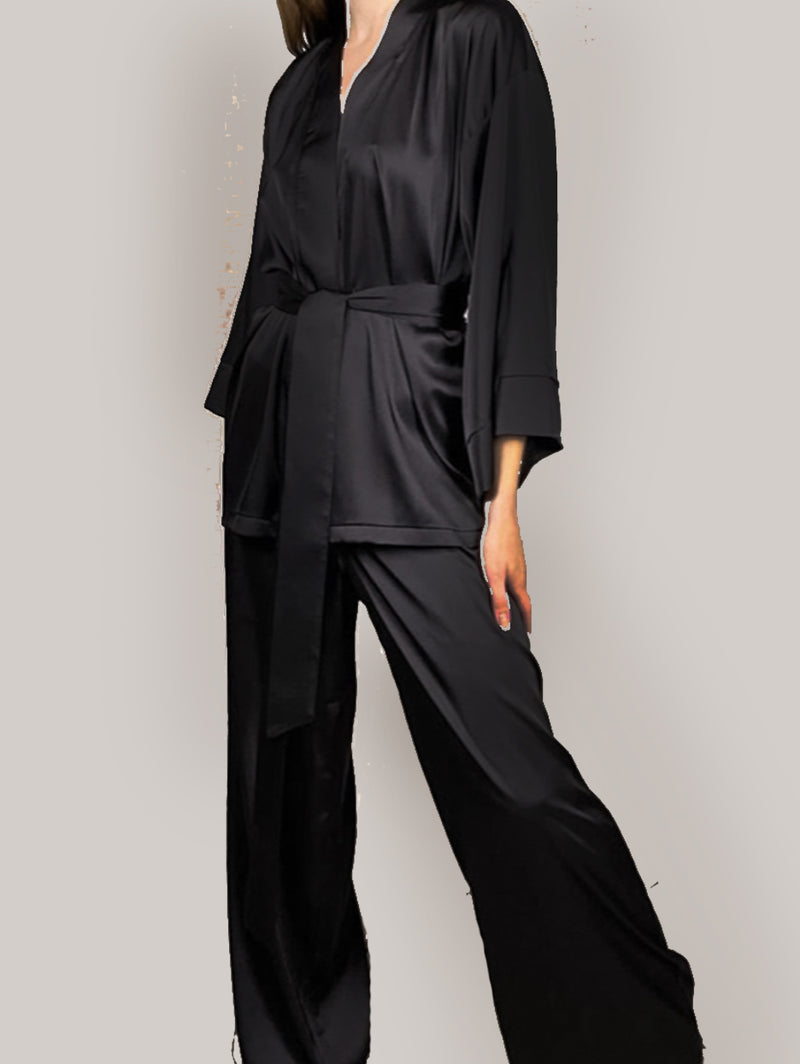 Tie your silk wrap in style with pajamas . A buttery soft silk wrap with a belt to wrap around your waist. Paired with soft and comfortable pajamas. Wear everyday and anywhere .
